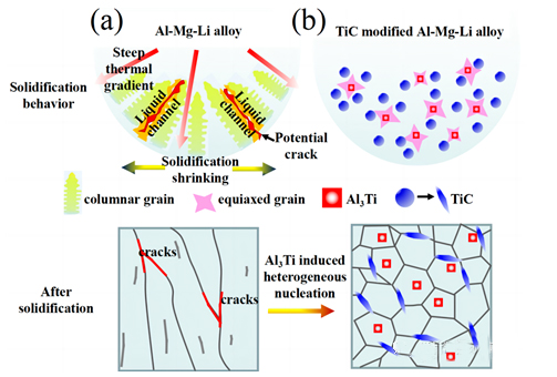 LPBF加工的(a)Al-Mg-Li合金和(b) TiC改性Al-Mg-Li合金的凝固行为和微观组织演变示意图